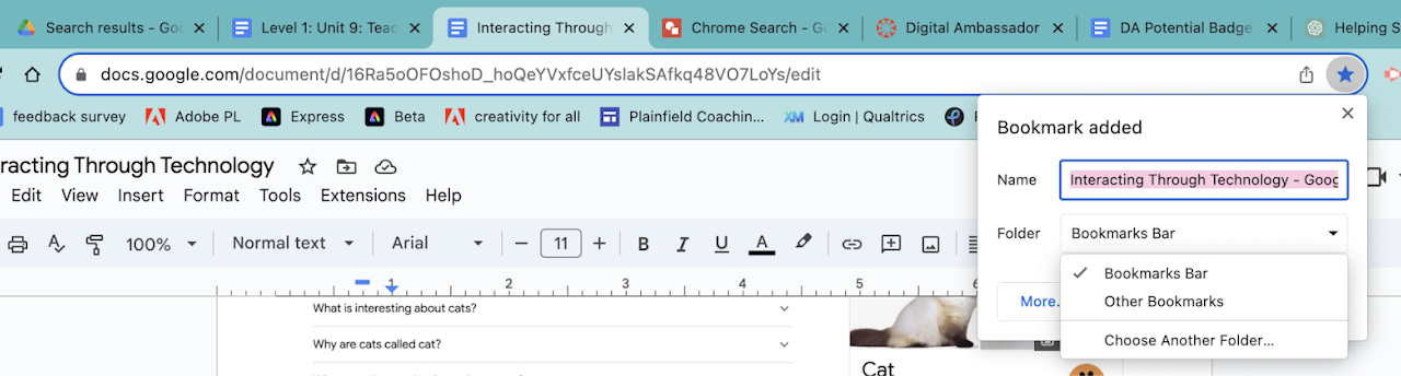 You'll quickly run out of room on your Bookmarks Bar if you don't shorten the name of the bookmark or create folders. Right-click (command click on a Mac) and select Edit to change the name. Chrome will put bookmarks into Other Bookmarks when it runs out of room on the Bookmarks Bar. A link to Other Bookmarks is displayed on the right side of the Bookmarks Bar. You can also access it through those same three vertical dots. Bookmarks can also be organized in folders you create. You can create topical folders, like Recipes or Gardening, and help your older adults store related bookmarks all in one place.